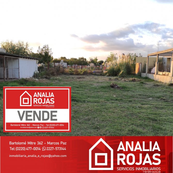 Excelente Oportunidad en Marcos Paz. Calle Miguel Cané, entre H D'Anillo y Roque Sáenz Peña. Hermosa zona de viviendas.. a metros del ramal tren Belgrano Sur y ruta 40. Frente 12,5, 24 de fondo. 300 M2 totales. No posee servicios instalados, pero pasan todos por el frente, listos para su extención o bajada. Se entrega el 60% y el resto se financia. Listo para escriturar. Para más info Servicios Inmobiliarios Analia Rojas 2227573144.