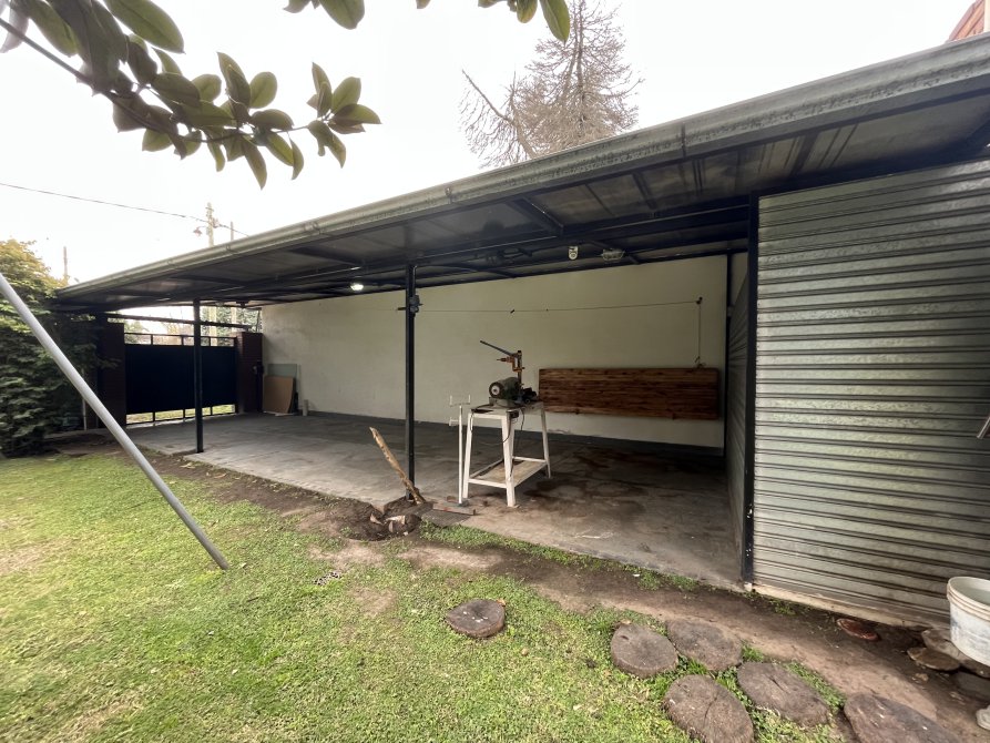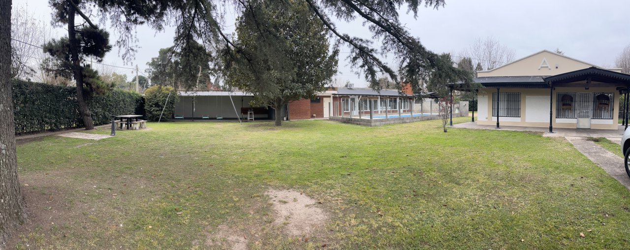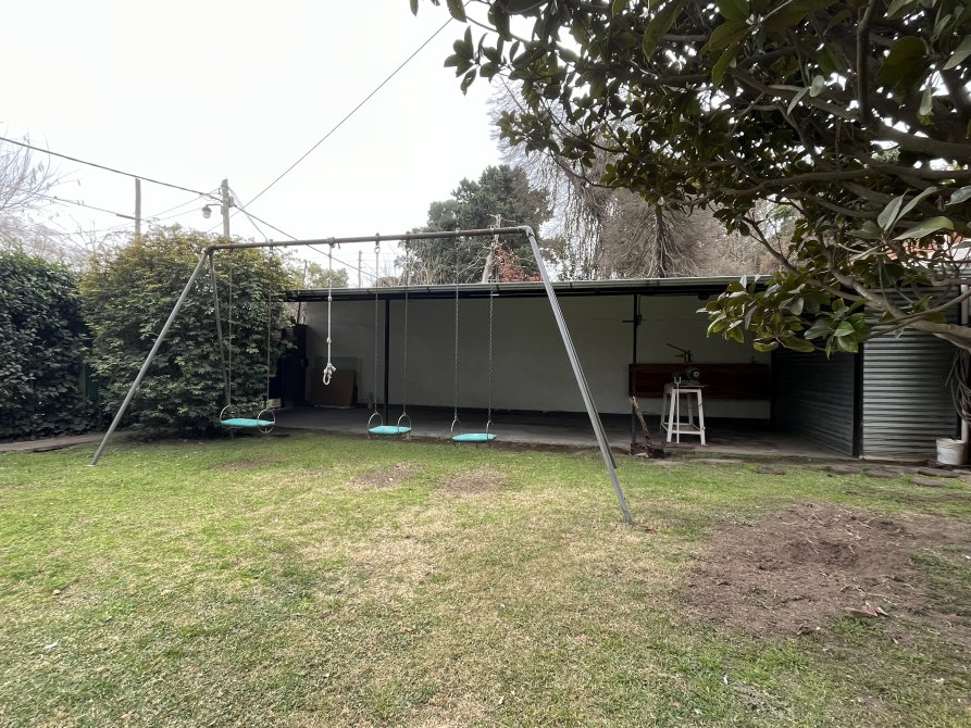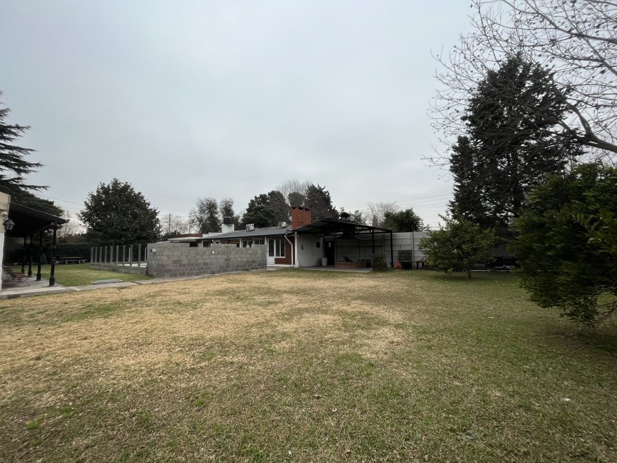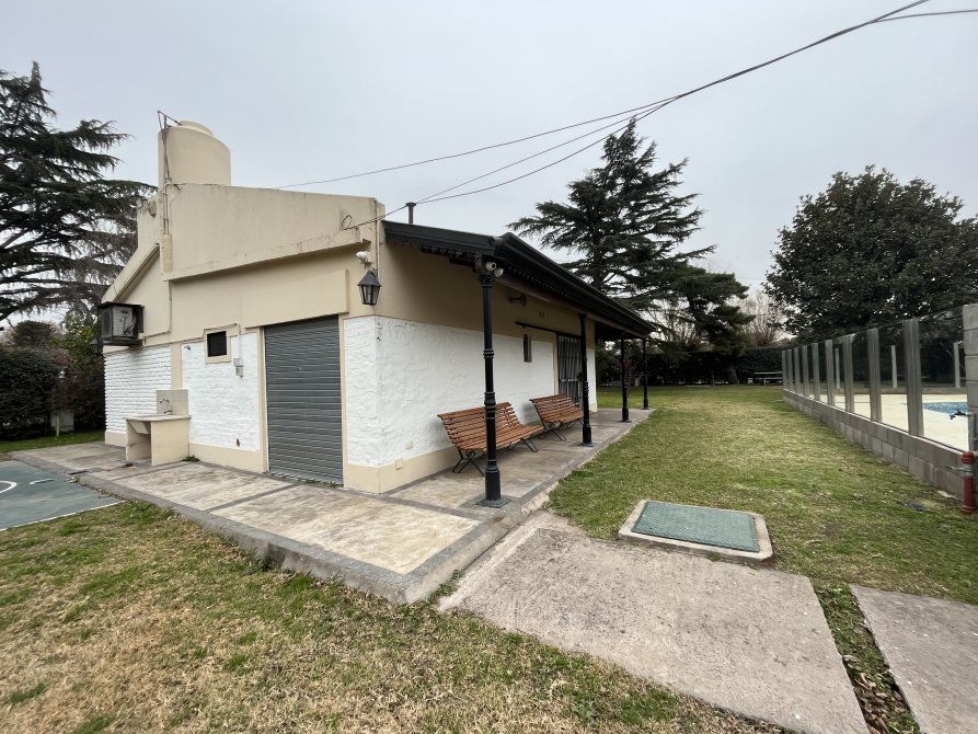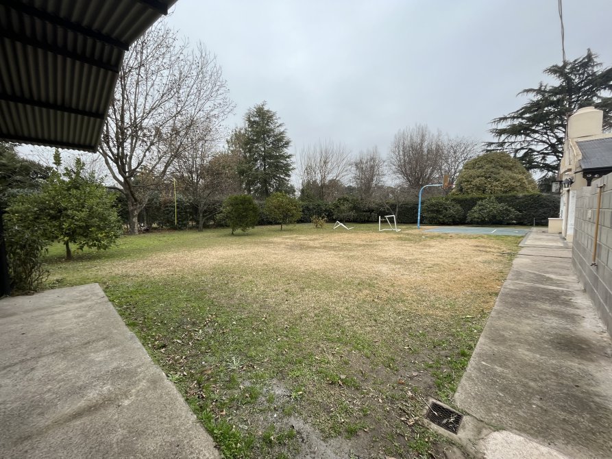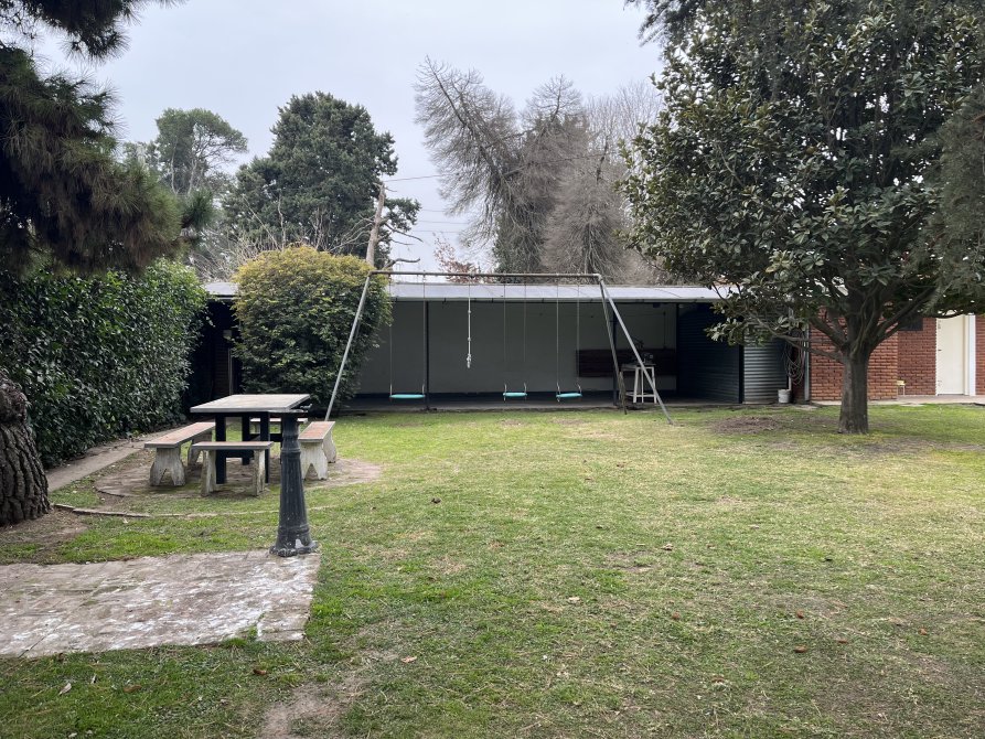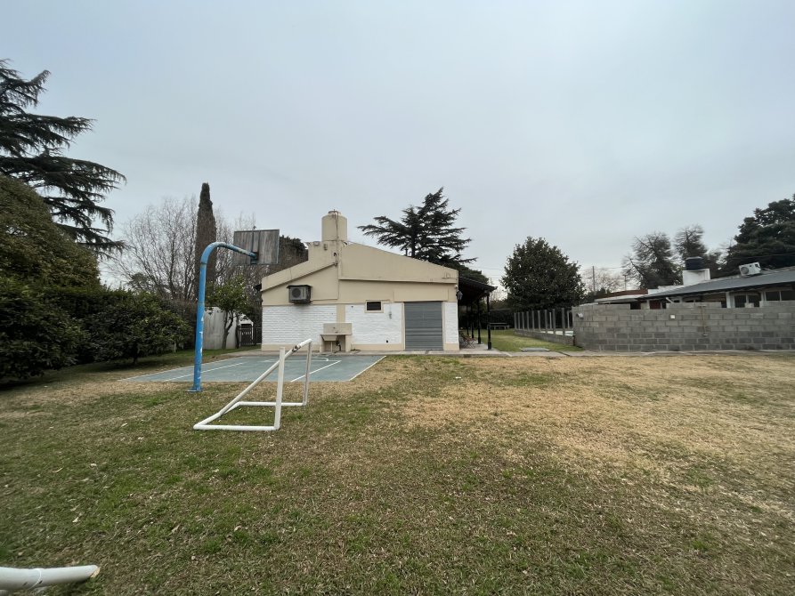 A los laterales se encuentra un quincho, un asador y la cochera.